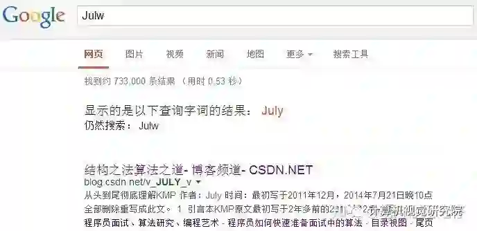 36、经常在网上搜索东西的朋友知道,当你不小心输入一个不存在的单词时,搜索引擎会提示你是不是要输入某一个正确的单词,比如当你在Google中输入“Julw”时,系统会猜测你的意图:是不是要搜索“July”