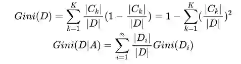 基尼指数反映了从数据集中随机抽取两个样本,其类别标记不一致的概率。因此基尼指数越小,则数据集纯度越高。基尼指数偏向于特征值较多的特征,类似信息增益。基尼指数可以用来度量任何不均匀分布,是介于 0~1 之间的数,0 是完全相等,1 是完全不相等。