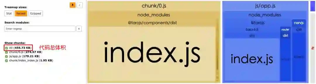这个文件占据了 462KB 的空间,并且由于模块规范等问题,无法进行 treeshaking。所以就算开发者在 Taro 的项目中只引入了两个组件,最终的打包结果也会包含所有的内置组件。