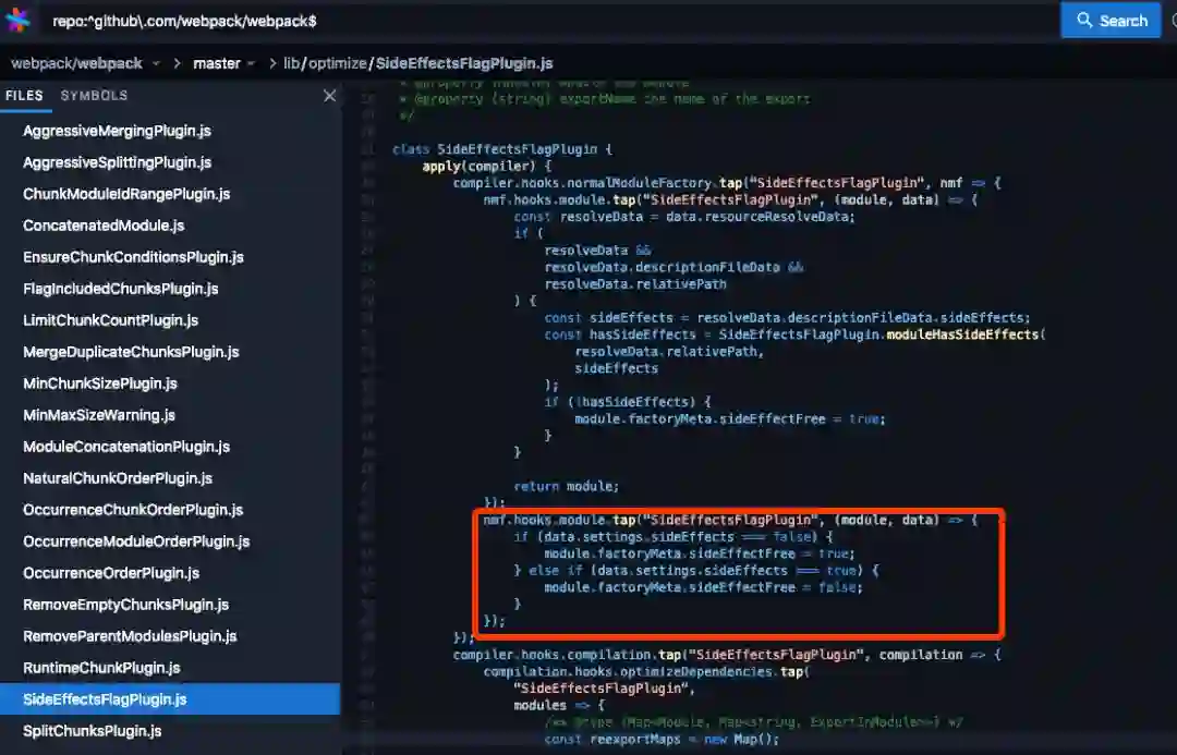 在 webpack 中,模块依赖分析是由内置插件 SideEffectsFlagPlugin(https://sourcegraph.com/github.com/webpack/webpack/-/blob/lib/optimize/SideEffectsFlagPlugin.js) 进行的。