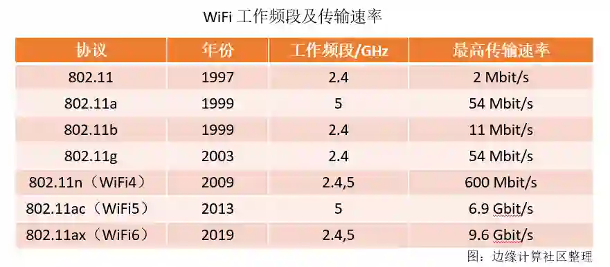 WiFi 6在160MHz信道宽度下,单流最快速率为1201Mbit/s,理论最大数据吞吐量9.6Gbps。跟前五代比一比: