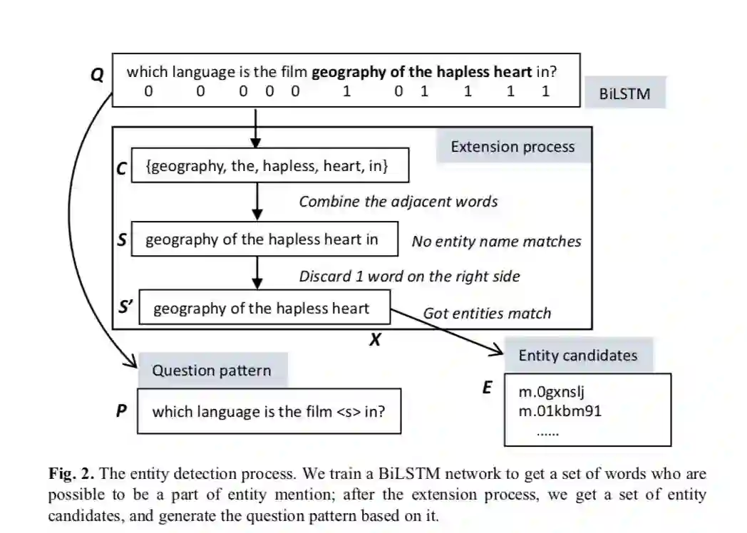 ⾸先利用 bilstm 训练模型,输入一个问句,如果是关键词则标记为 1,否则标记为 0. 然后将标记为1的词拿出来进行 entity dectction. 作者提出了一种选取 entity candidates 的方法, 大致分为四个步骤: