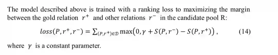 训练过程中使用 margin ranking loss, 保证正确的relation与问句的匹配得分比负例要高:
