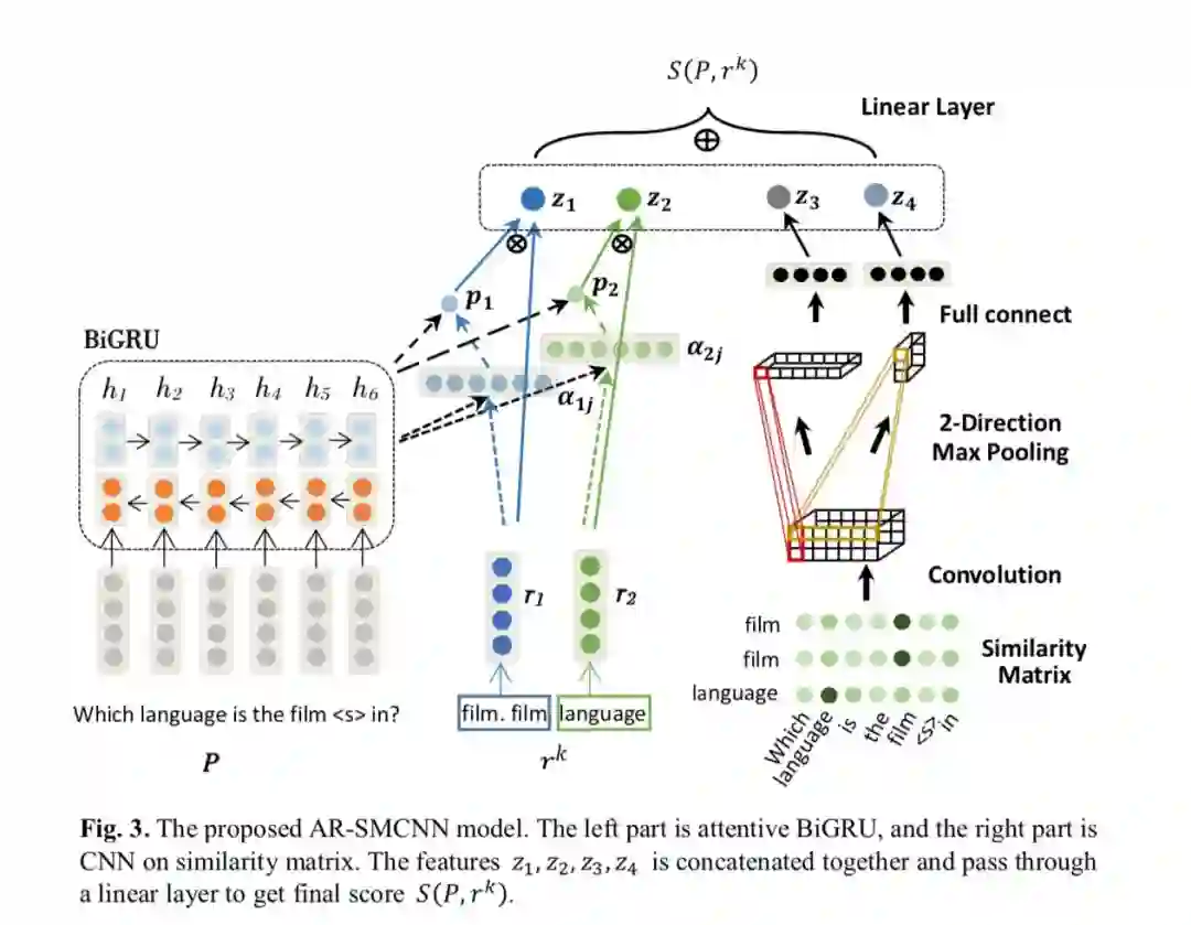 作者提出一种称为 attentive recurrent neural network with similarity matrix based convolutional neural network 网络结构,同时运用 attentive rnn 以及 cnn 来得到 question 与 kb facts 之间的相似度从而给出匹配得分. 上图为完整的流程示意图.