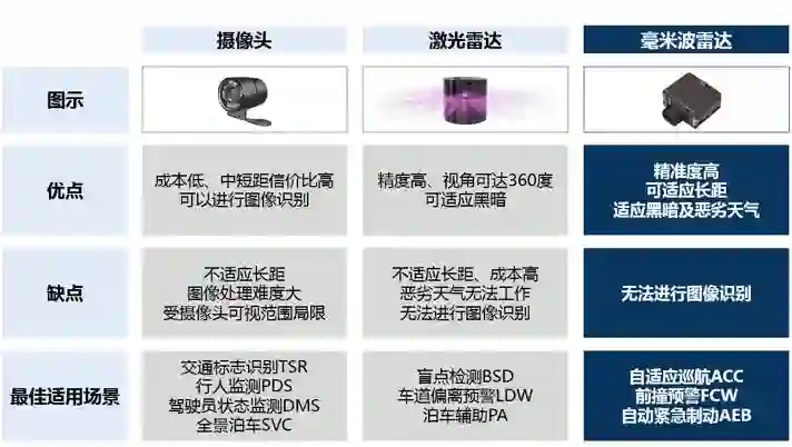 现阶段,厂商采用的AEB方案主要包括单纯依赖毫米波雷达、单纯依赖摄像头,以及依赖毫米波雷达、摄像头传感器融合等方案。众所周知,视觉方案受黑夜、烟雾、暴雪等工况影响大,很容易失效和误判;雷达方案不惧怕黑夜场景,但单独依赖雷达检测,对静止物体、行人等目标的识别难度大,易发生失效。激光雷达是少数厂商考虑纳入AEB方案的传感器之一,但基于量产和成本因素限制,视觉传感器和毫米波雷达方案依然是行业主流。