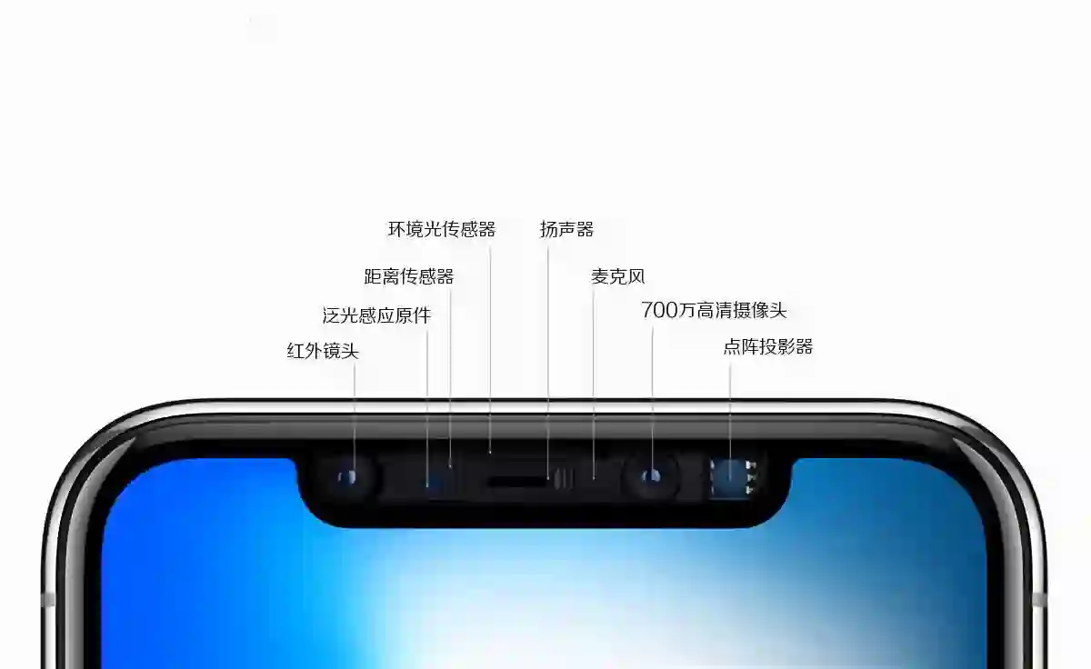 首先我们先说一下iphone X的面部识别技术。iphone X的Face ID和其他厂商有很大的不同,iPhone X的刘海部分除了传统的前置摄像头、听筒、环境光线、距离传感器之外,还额外集成了红外线镜头、泛光照射器(发射不可见的红外光线,使得黑暗中也可以让红外镜头顺利地捕捉面部的点阵图案)、测绘点投射器(投射超过30000个肉眼看不见的光点,并对它们进行分析,为脸部绘制精确细致的深度图,同时通过独立的神经引擎,即时处理用户面部数据)。