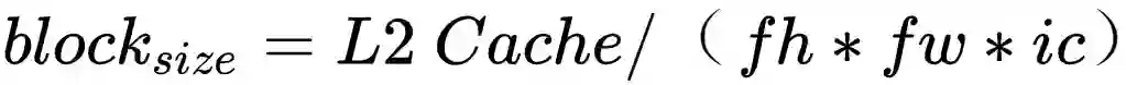 Im2col+MatMul 优化卷积计算时,比如输出 feature map 的数据格式为 [n, oc, oh, ow],卷积核的大小为 fh*fw,那么 Im2col 转换之后的数据格式为 [n, fh*fw*ic, oh*ow]。MegEngine的分块操作在oh*ow维度上,分块大小通过公式