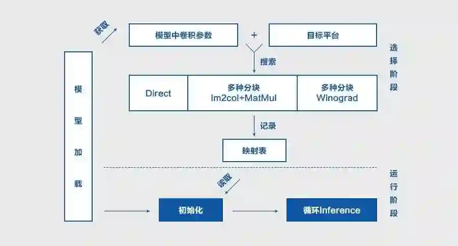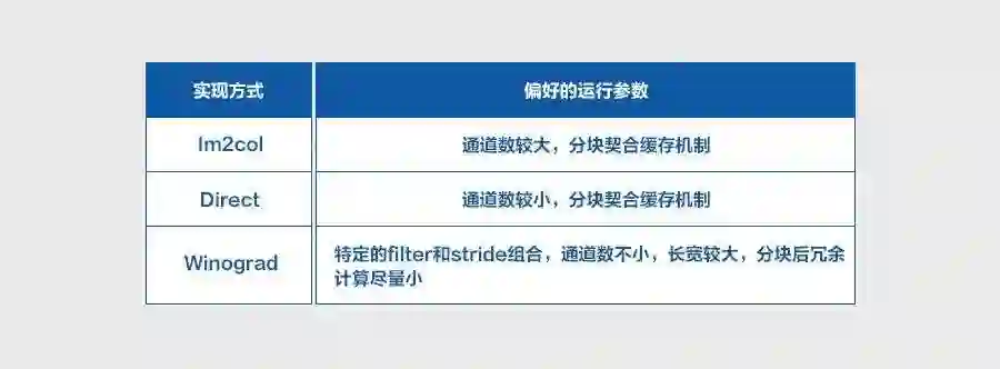 卷积计算有多种优化实现,侧重点也各有不同,比如 Im2col 可以平衡内存占用和运行速度,Direct 直接进行卷积计算优化,Winograd 则是优化计算复杂度。每种优化实现都在特定的输入参数下有一定的优势,并随着推理平台的不同而发生变化,因此不够灵活,无法选择最优实现。上述实现的启发式偏好如下所示: