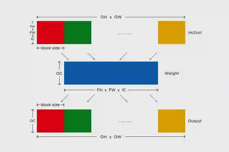 Im2col+MatMul 是一种针对深度神经网络卷积计算的高效实践方法。Im2col(Image to Column)把输入 feature map 按照卷积核的形式一一展开并拼接成列,接着通过高性能 MatMul(Matrix Multiplication) Kernel进行矩阵乘,得到输出 feature map,具体原理可参考论文[1],它的本质是把卷积运算转换成矩阵运算。