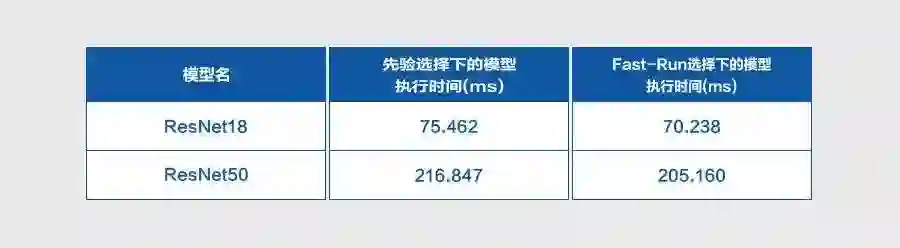 经典卷积网络上的实验测试证明了 Fast-Run 机制的自适应优势,优化效果明显,其模型执行效率优于先验选择下的执行效率,具体结果如下所示: