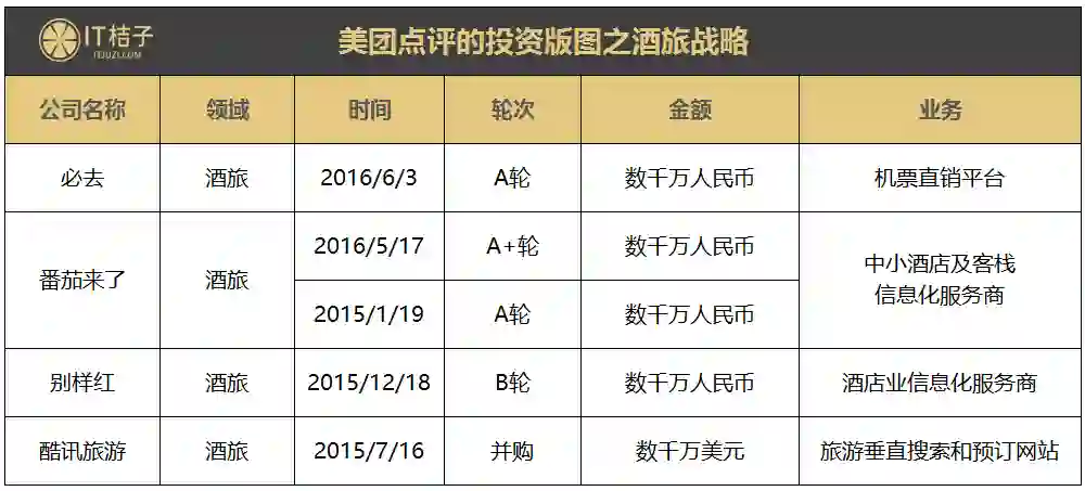 另外,在投资布局方面,美团点评相继投资并购过旅游垂直搜索和预定网站「酷讯旅游」、酒店业信息化服务商「别样红」、中小酒店及客栈信息化服务商「番茄来了」,以及机票直销平台「必去」。