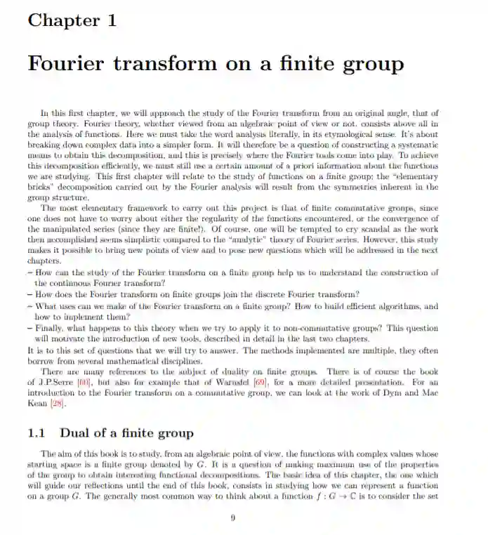 第一章用群论的语言来解释主要概念,并解释后面将用到的符号。第二章将所得结果应用于各种问题,并首次接触快速算法(例如Walsh 变换)。第三章对离散傅里叶变换进行了阐述。第四章介绍了离散傅里叶变换的各种应用,并构成了对前一章的必要补充,以充分理解所涉及的机制以及在实际情况中使用。第五章围绕傅里叶变换提出了更多新颖的思想和算法,产生了大量的应用。第六章需要一些更高级的知识,特别是对有限场理论的一些熟悉。它研究了有限域中的值变换,并给出了在校正码中的应用。最后两章(最困难的一章),具有更多的代数性质,并建议推广已经在有限非交换群的情况下进行的构造。第七章揭示了线性表示的理论。第八章和最后一章将这一理论应用于理论(群的简洁性研究)和实际(光谱分析)领域。