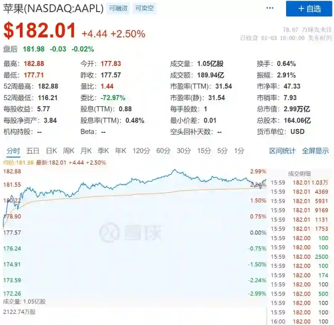 在今年的首个交易日 1 月 3 日,苹果公司成为了全球第一家市值达到 3 万亿美元的公司。虽然当天收盘时股价略低于这一里程碑,但仍涨 2.5%,股价 182 美元。
