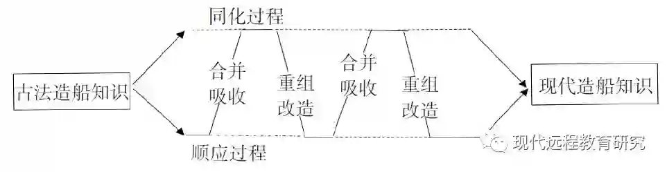 同化顺应学习是大国工匠们常见的一种学习类型,这种学习能有效扩展、更新工匠的知识技能。以方文墨为例,从沈飞民品公司调入沈飞军品厂这一心目中的技术胜地之后,他开始拜师学艺,集纳各家之长,努力继承优点,想办法改正缺点,他的技术在短时间内有了质的飞跃。方文墨的这一学习过程就同时包含了同化和顺应,兼有量的扩展和质的提升。在古法造船基础上学习现代造船知识的张兴华经历的也是同化顺应学习交融、互动的过程:痴迷于造船的张兴华不满足于古法造船,他希望掌握现代造船知识,毕业于大连海洋大学船舶制造专业的女儿成了他最好的老师。之前张兴华用手画图纸,误差最大时达10毫米,学会用电脑设计图样之后,他画图纸的精确度能达到1毫米。基于比耶格等人的同化顺应学习模型,张兴华的同化顺应学习可以简化为图2所示的模型。该模型既演示了同化顺应的学习过程,也含纳了最终学习结果。