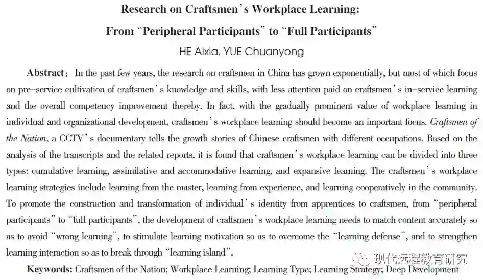 引用:何爱霞,乐传永(2018).从“边缘性参与者”到“充分参与者”的工匠工作场所学习研究[J].现代远程教育研究,(6):55-63.