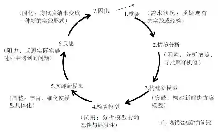 拓展性学习(Expansive Learning)又被译为扩展学习、展化学习,是由芬兰学者恩格斯托姆于1987年提出的一种新的学习隐喻。拓展性学习主要是从文化创新与变革的视角看待学习。换言之,与传统学习不同,拓展性学习的目的不是为了获取已经存在的知识技能,而是为了建构新的客体和活动系统。对于大国工匠们来说,社会快速变革的要求和自身作为职业领军人的使命,都使拓展性学习成为其职业生涯高峰期的必然选择。恩格斯托姆用拓展周期描述了拓展性学习的典型步骤(见图3):(1)质疑:个体对现有的实践或经验进行批判或怀疑;(2)情境分析:分析产生质疑的原因,包括实践情境的变化,以便找出问题的解释机制;(3)构建新模型:通过将公共认知中的最新解释关系做成简洁模型;(4)检验模型:通过对模型的试用把握其动态性、潜在性与局限性;(5)实施新模型:通过实际应用,进一步丰富、细化模型以使之完善;(6)反思:反馈和评价整个拓展的过程;(7)固化:将模型的试验结果变成一个新的、稳定的实践形式(吴刚等,2016)。