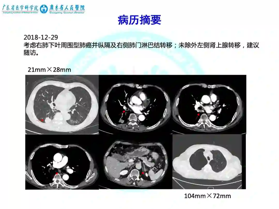 3)术后病理右中下肺肿物与右上肺肺疱均为腺鳞癌,N1、N2转移。