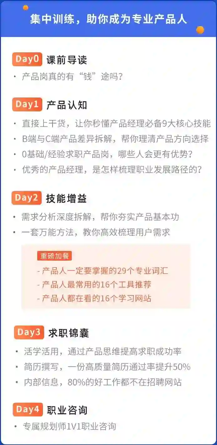 两门课都包含“9节视频课+4天社群免费答疑+1次职业咨询”,帮你系统建立行业认知,掌握产品/运营的核心本质,快速入门/入行!