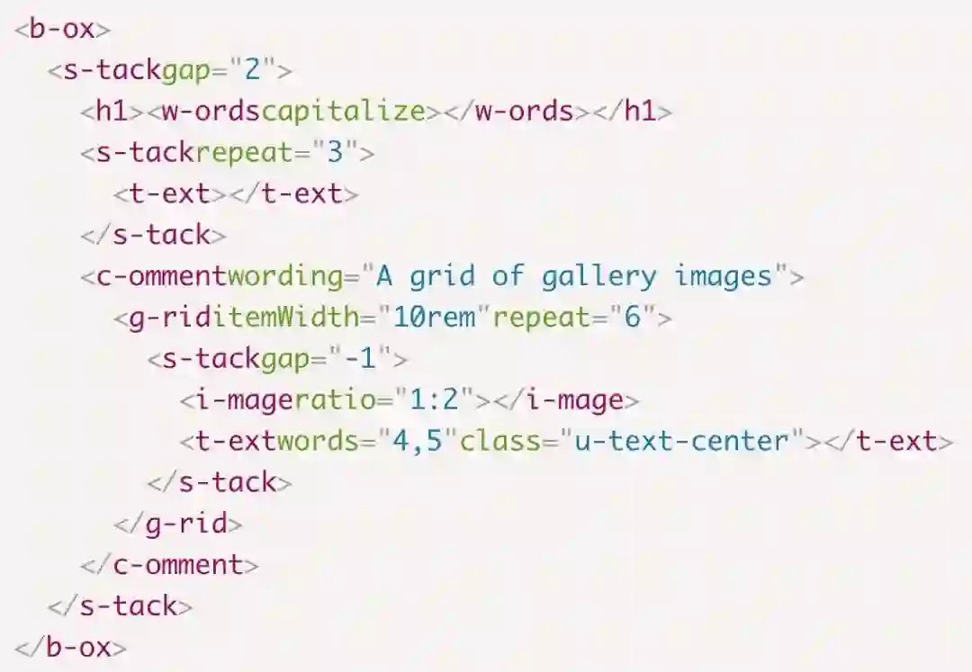 Bruck 可以生成屏幕阅读器可访问和响应式的布局,无需编写 CSS 断点。Bruck 组件提供了常见的布局模式,并带有可配置的填充内容。例如,下面的代码将生成一个布局,其中包含三个连续的文本块(),后面跟上一个图库网格(<g-rid itemWidth="10rem" repeat=“6">)。网格布局包含六张以 1:2 比例显示的图像(),每张图片下方的标题居中(class="u-text-center")。设计师还可以加入注释(<c-omment wording="A grid of gallery images”>),这样有助于设计人员和开发人员之间进行沟通。