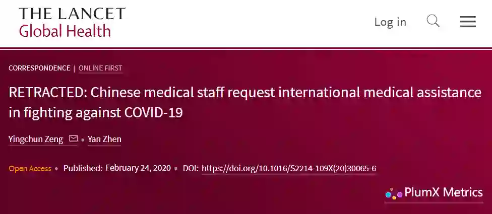 撤稿经过:该篇通讯文章发表后,有人注意到,两名作者在论文的第一段写道:“我们于 1 月 24 日到武汉…是第一批从广东来到武汉的医疗支援人员”。但问题是,第一批广东援助湖北武汉医疗队成员名单中,并没有看到这两位作者的名字。这引起广东援助湖北武汉医疗队的不满,认为作者盗用了他们的名义,并要求作者道歉和撤稿。后续,两名作者向《柳叶刀》提出撤稿申请,并在撤稿说明中表示她们的信息并不是一手的。