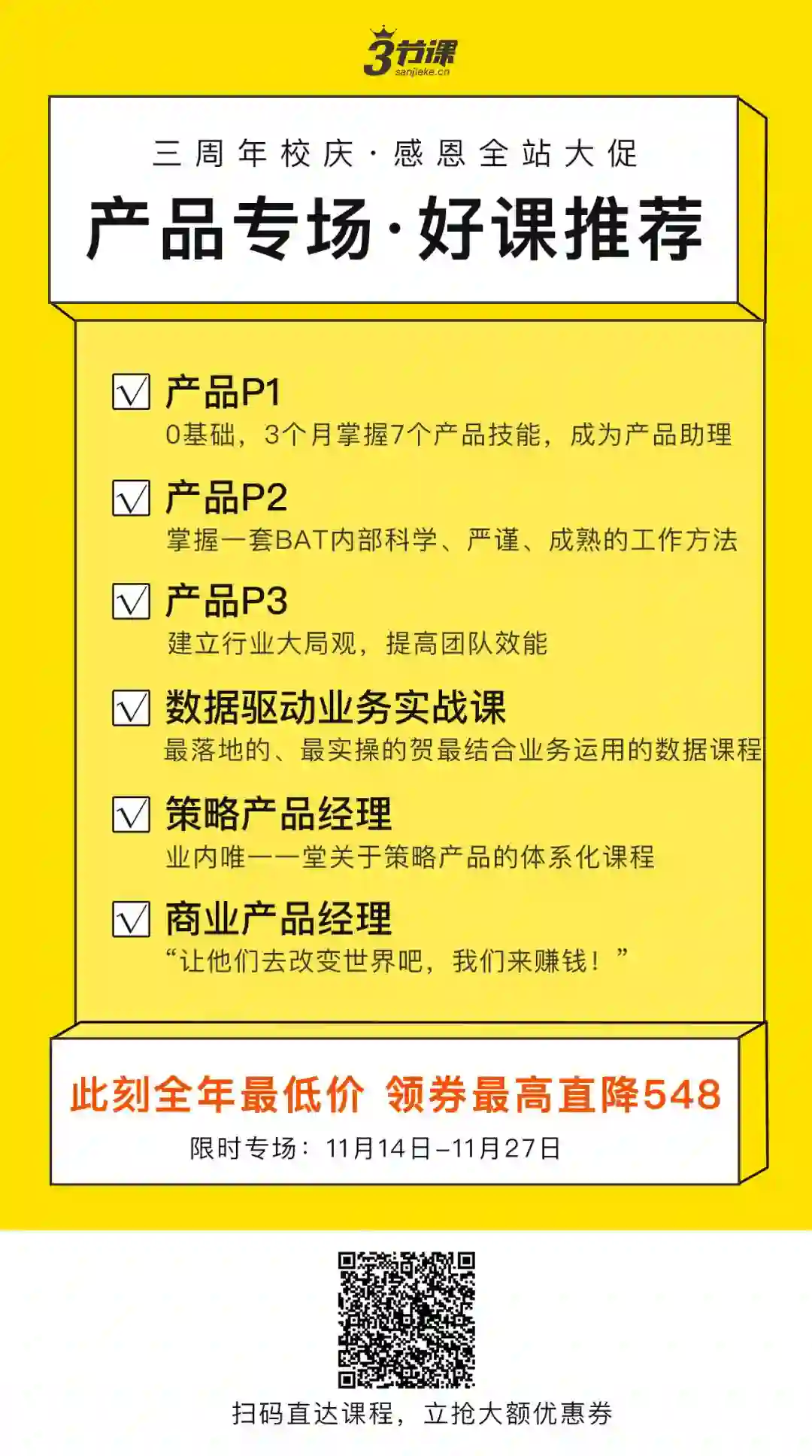 即日起至11月27日,购买三节课所有产品课程,除了可以使用优惠券,还有额外优惠!扫描下方海报中的二维码即可前去选课报名。