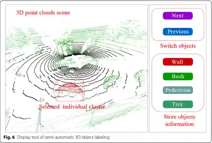 由于LiDAR生成的点云数据具有稀疏、无纹理信息的特点,为了更加准确地判定物体的种类,该团队开发了如下图所示的半自动样本标记工具,结合障碍物周围的场景信息,提升障碍物的人工标签准确率。为了提升数据库中的点云样本质量,已将存在遮挡、结构不完整的点云样本剔除,尽可能保留结构较为完整的物体点云。