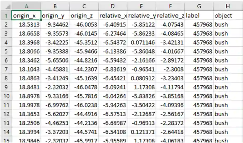 LSOOD数据集中点云样本存储在.csv文件,每个.csv文件存储了不同的物体信息,包含了物体点云的x,y,z全局坐标(origin),物体中心为原点的局部坐标(relative),以及对象标签(object)。