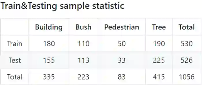 目前LSOOD数据集包含建筑样本335,灌木223,行人83,及乔木415个。后续将公开更多的样本及分类类别。