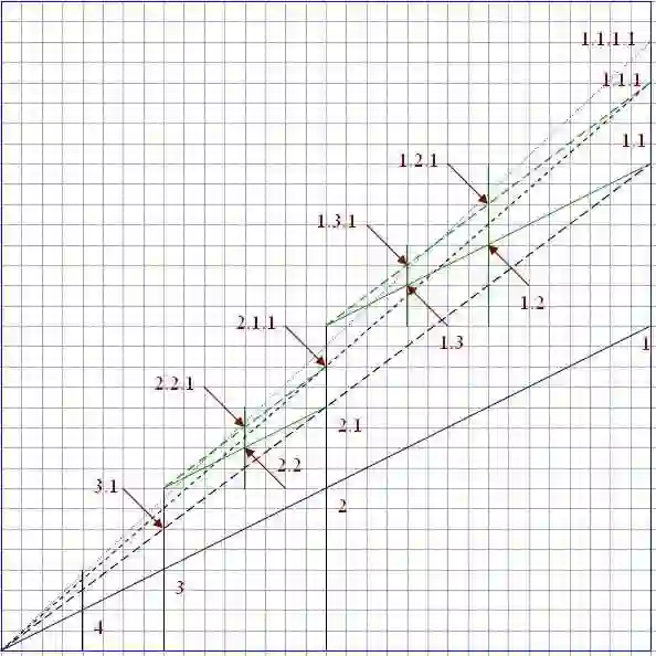 首先,我们在XY平面上定义2个点。深度优先集合点和广度有限集合点,针对点<x=1,y=1/2>的深度优先集合点为<x=1,y=1>,广度优先集合点为<x=1/2,y=1/2>。接下来我们定义第一个子节点的位置为父节点和深度优先集合点的中间点。兄弟节点则为前一个子节点到广度优先集合点的中间点,如上图所示,节点1.2的位置为<x=3/4, y=5/8>。