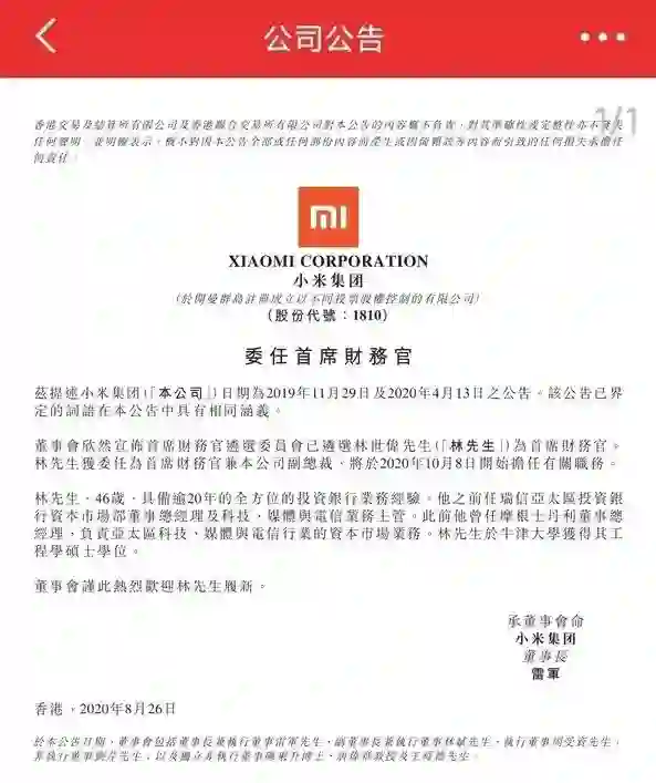 【小米任命林世伟为首席财务官】