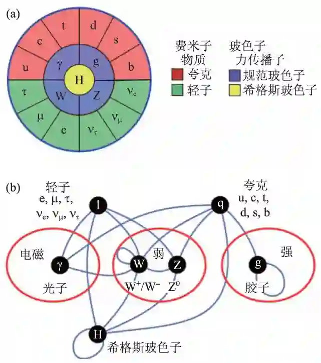 图1 (a)标准模型基本组分粒子;(b)标准模型粒子之间的相互作用
