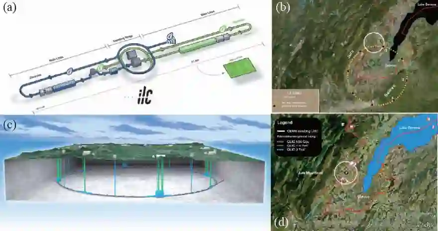 图3 可能的正负电子Higgs 粒子工厂:ILC(a),FCC(b),CEPC(c)以及CLIC(d)。其中FCC和CLIC示意图中,白色小圈代表LHC