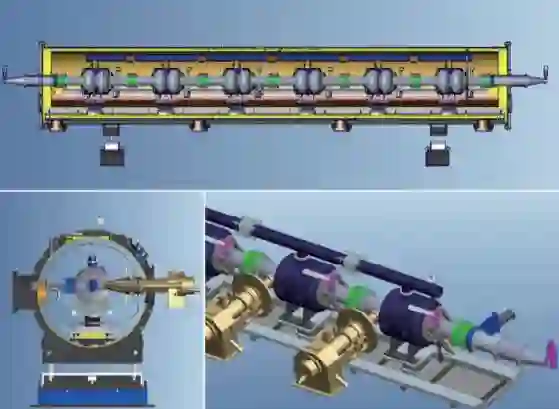 图10 CEPC主环上的低温单元设计图。整个系统利用液氦冷却稳定在2 K的低温,以保持650 MHz超导高频腔正常工作[7]
