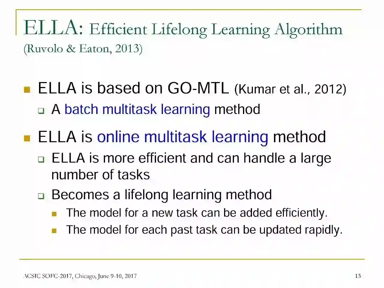 ELLA是在线多任务学习方法,更高效并能处理大量任务。ELLA是一种终身学习方法,可以高效地添加新任务的模型,每个过去任务的模型都可以快速更新。