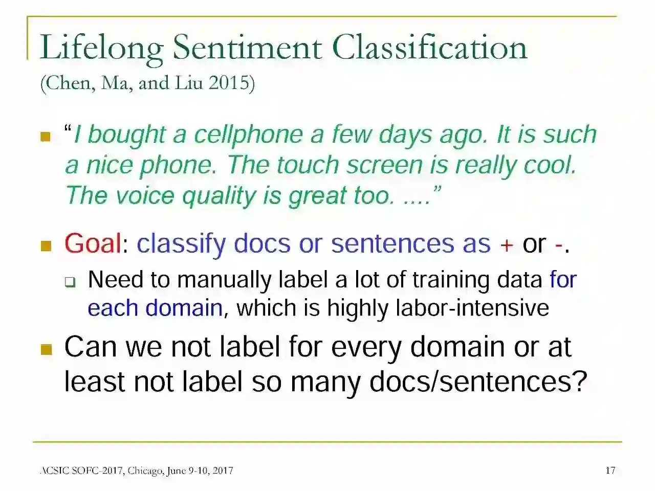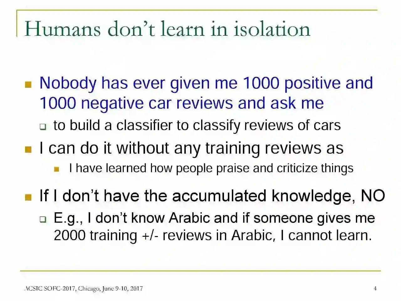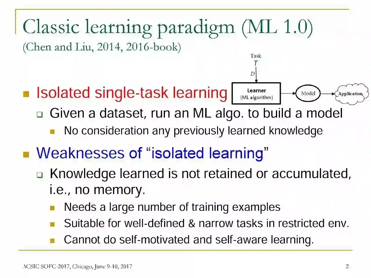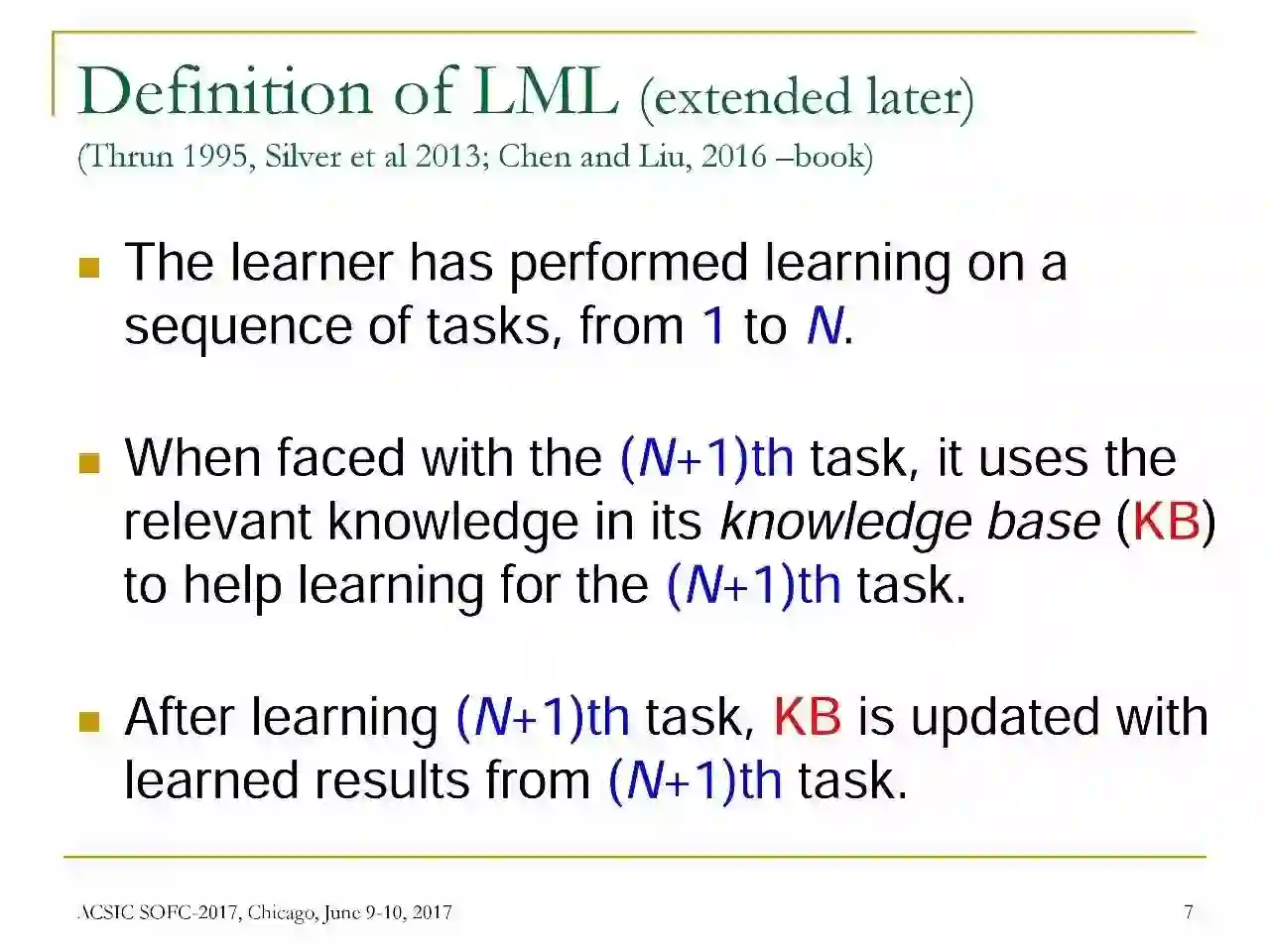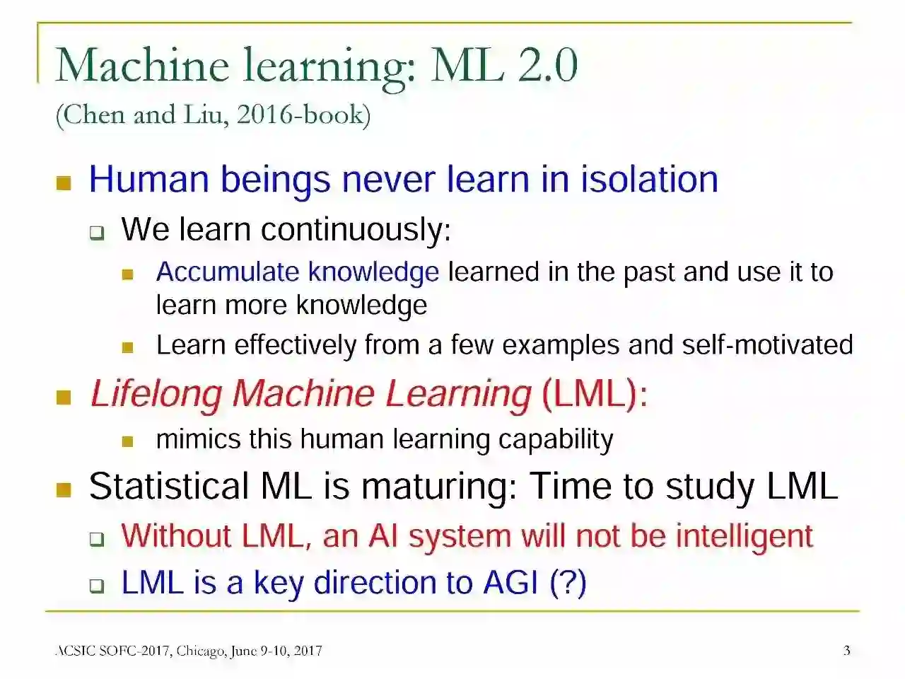 【新智元导读】第一届北美计算机华人学者年会暨计算技术前沿研讨会于 2017 年 6 月9-10日在芝加哥举行。这是会议是华人计算机学者的顶级盛会,新智元从会议主办方处获得了伊利诺伊大学芝加哥分校刘兵教授在会上的演讲PPT,刘兵教授以《打造能够终身学习的机器》为题,介绍了终身机器学习(Lifelong Machine Learning,LML)系统,尤其是 LML 在自然语言处理中的应用。