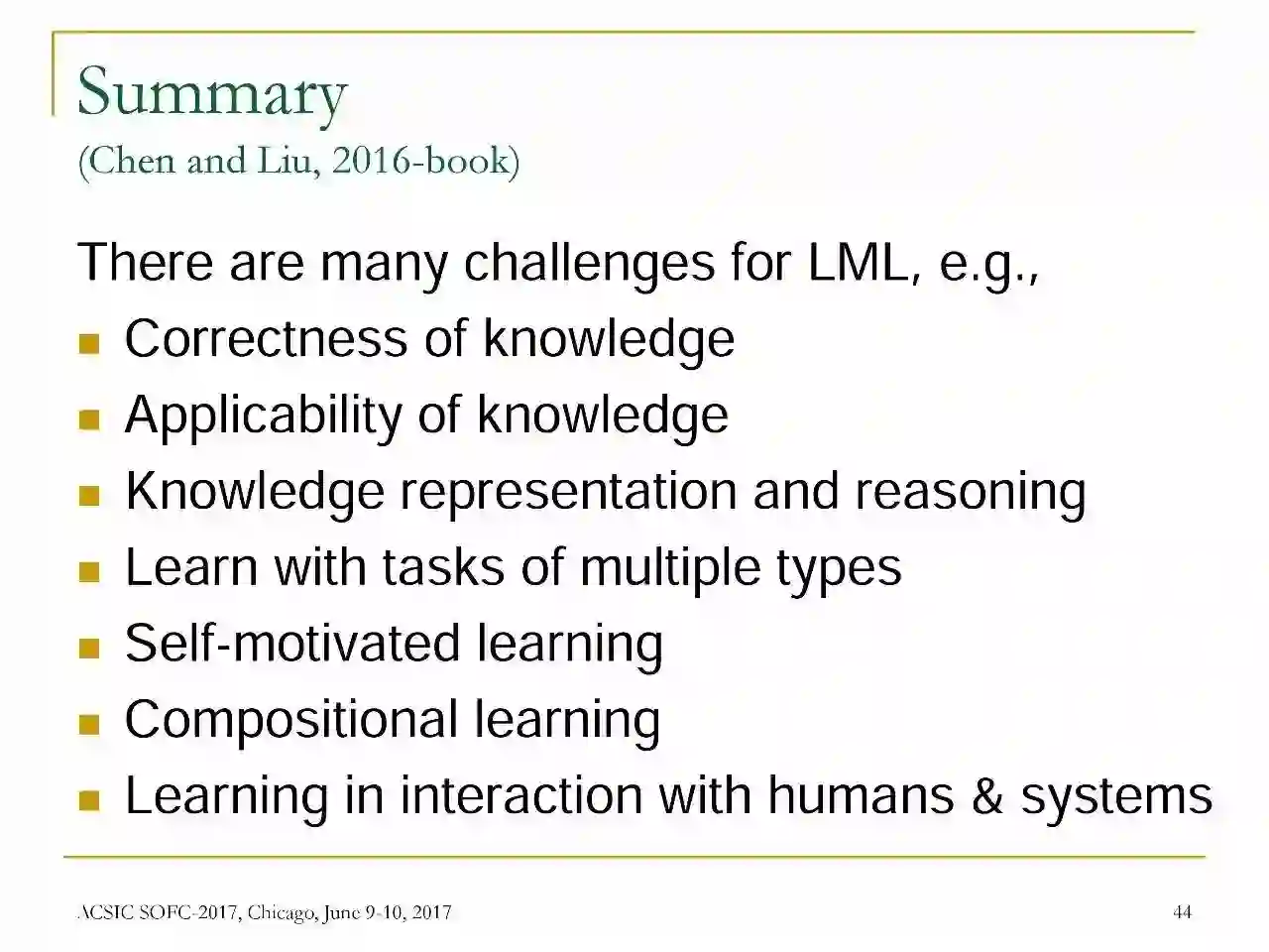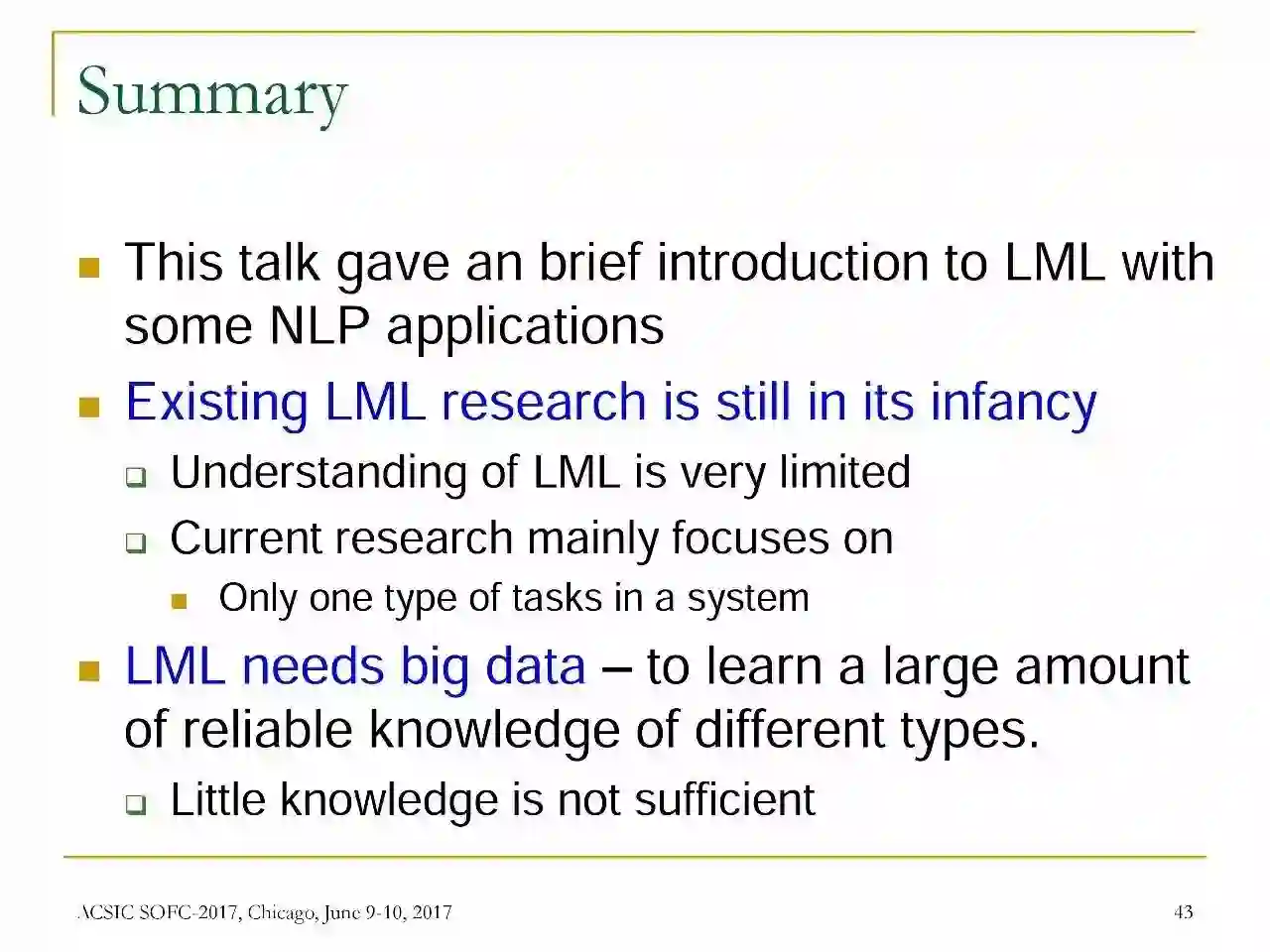 LML的研究现在还处于起步阶段,对LML的了解非常有限,目前的研究主要集中在只有一种类型任务的系统。LML需要大量数据,以学习大量不同类型的知识。