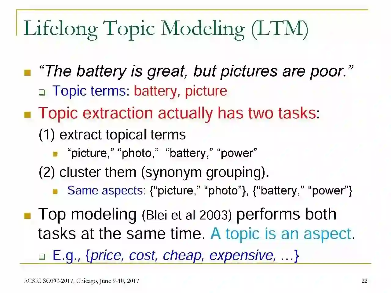 好的模型(Blei et al 2003)同时执行这两个任务。主题就是一个aspect,例如,{价格,成本,便宜,昂贵,...}