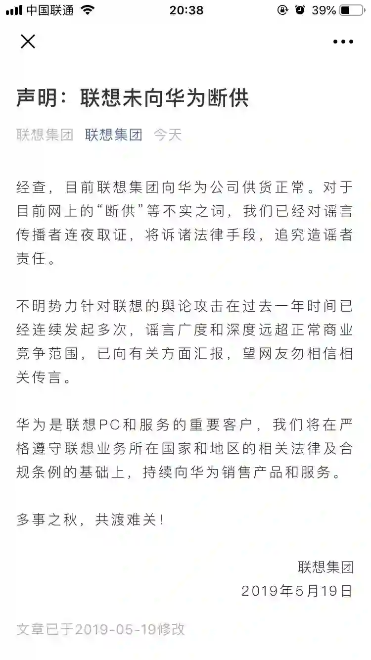 今日上午,联想集团官方公众号发布声明进行了辟谣。联想集团声明表示,目前联想集团向华为公司供货正常。对于目前网上的“断供”等不实之词,我们已经对谣言传播者连夜取证,将诉诸法律手段,追究造谣者责任。