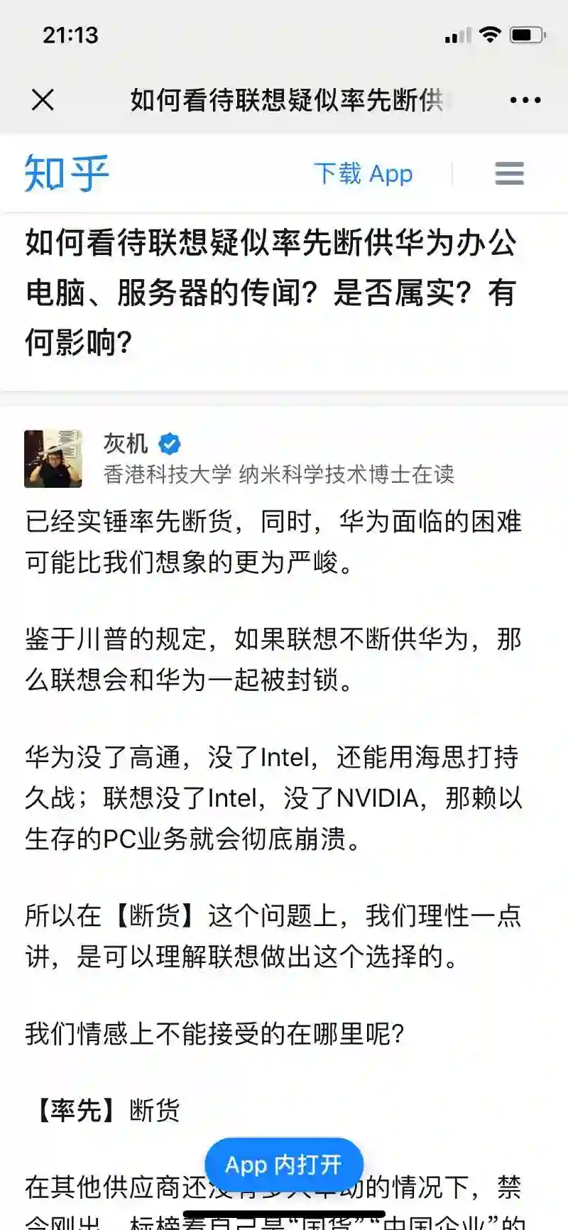 此前有消息称联想率先断供华为办公电脑、服务器,该博主在知乎发表言论并在网络上迅速发酵。