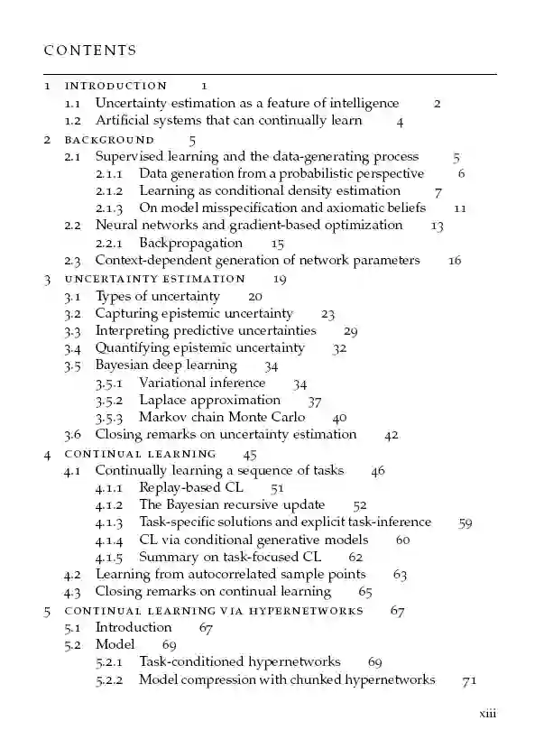 我们首先将这项研究置于一个更广泛的背景下,并提供对不确定性估计和持续学习领域的介绍。对于那些有兴趣熟悉这些主题的人来说,这个详细的回顾可以成为一个入门点。在奠定这个基础之后,我们将深入研究如何持续学习一组任务的具体问题,并提出我们基于神经网络系统解决这一问题的方法。更具体地说,我们训练一个元网络为推理模型生成特定于任务的参数,并表明,在这种设置下,可以在元级别使用简单的正则化来防止遗忘。由于任务特定解决方案的存在,出现了必须推断不可见输入所属的任务的问题。我们研究了解决这一任务推理问题的两种主要方法:(i)基于重玩的方法和(ii)基于不确定性的方法。尽管基于重放的任务推理在简单的基准测试中表现出了显著的性能,但我们的这种方法的实现依赖于生成建模,随着任务复杂性的增加,这变得不成比例地困难。另一方面,基于不确定性的任务推理不依赖外部模型,更容易扩展到复杂的场景。因为校准任务推断所需的不确定性是困难的,在实践中,人们经常求助于应该知道他们不知道的东西的模型。这在理论上可以通过对模型参数的贝叶斯处理来实现。然而,由于对基于神经网络的模型的先验知识的难以解释,也就很难解释模型知道什么是不知道的。这种认识的意义超越了持续学习,更普遍地影响了当前机器学习模型如何处理看不见的输入。我们讨论了神经网络中与选择先验知识相关的复杂性,并表明常见的选择往往导致不确定性,这些不确定性在本质上不能反映特定的需求数据,如检测模型不应推广到的看不出的输入。