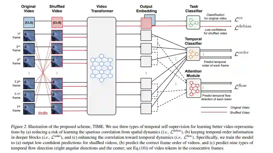 理解视频的时间动态是学习更好的视频表现的一个重要方面。最近,基于transformer的架构设计在视频任务中得到了广泛的探索,因为它们能够捕获输入序列的长期依赖性。然而,我们发现这些视频transformer在学习空间动力学而不是时间动力学时仍然是有偏的,去偏伪相关对它们的性能至关重要。基于观察结果,我们为视频模型设计了简单而有效的自监督任务,以更好地学习时间动态。具体来说,为了消除空间偏差,我们的方法学习视频帧的时间顺序作为额外的自监督,并强制随机洗牌的帧具有低置信输出。此外,我们的方法学习连续帧之间视频标记的时间流方向,以增强与时间动态的相关性。在各种视频动作识别任务下,我们证明了我们的方法的有效性,以及它与最先进的视频transformer的兼容性。