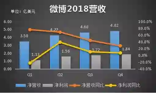 一个很明显的趋势是:2017 年微博营收的各季度增长在不断提速越跑越快,而其 2018 年的增长则在逐季度降温萎缩。2017Q1 其净营收同比增长为 0.799 亿美元,Q4 同比增长已经拉大到 1.647 亿美元。同样的数据在 2018 年 Q1 为 1.507 亿美元,到了 Q4 反而缩至 1.045 亿。