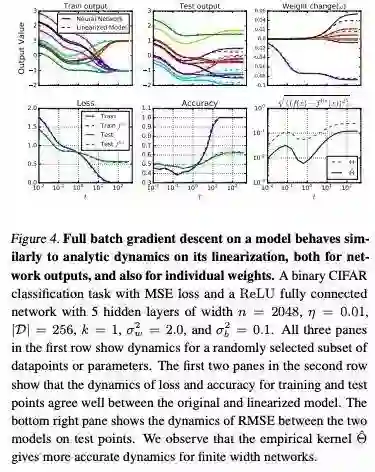 对于这种诱导的线性模型,梯度下降的动态机制变得易于分析了。虽然线性化只在无限宽度限制下是较精确的,但我们发现,即使是有限宽度的情况下,原始网络的预测与线性化版本的预测仍然非常一致。这种一致性在不同的架构、优化方法和损失函数之间都存在。