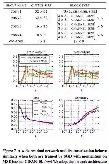 实验中,他们将一个实际的神经网络训练过程与线性模型的训练过程相比,发现两者高度一致。这里用到的神经网络是一个 wide ResNet,包括 ReLU 层、卷积层、pooling 层和 batch normalization;线性模型是用 ResNet 关于其初始 (随机) 参数的泰勒级数建立的网络。