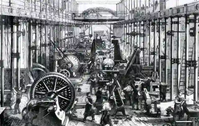 18世纪之前,人不知工厂为何物。商品都是手工、家庭、作坊制造。工业革命后出现工厂,发展出高度集中的规模生产。标准化部件的制造制度(源于英国,在美国得到广泛应用)被亨利•福特(Henry Ford,1863~1947)在汽车工业中发展成生产流水线,大大提高了生产力。