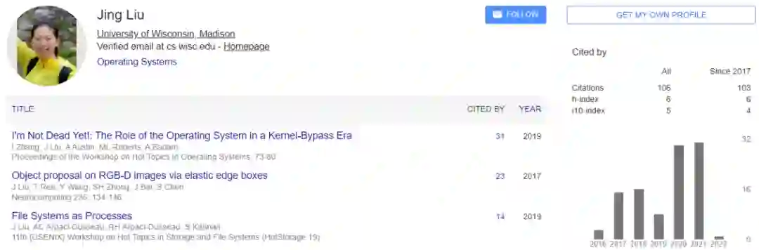 Jing Liu 是威斯康星大学麦迪逊分校计算机科学专业的博士生,其导师是 Andrea Arpaci-Dusseau 教授和 Remzi Arpaci-Dusseau 教授。她的研究兴趣在于存储系统,重点关注规模和性能。她还研究分布式存储系统的可调度性和可靠性。在加入威斯康星大学麦迪逊分校之前,她获得了南京大学的学士学位。