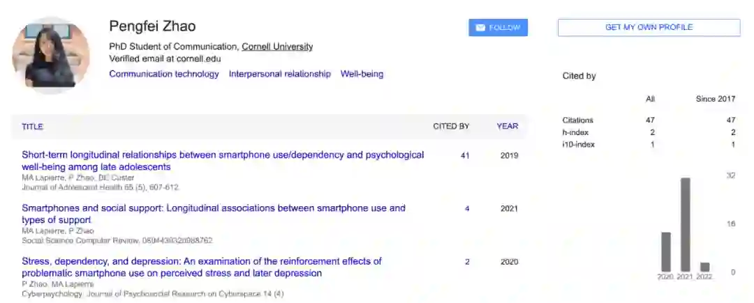 Pengfei Zhao 是康奈尔大学传播系的一名博士生,导师为 Natalie Bazarova 博士。研究兴趣为新的通信技术、人际沟通和幸福感的交叉研究。具体来说是研究新的通信技术,如智能手机和社交媒体,如何影响自我表露、社会支持、关系的开始和发展以及幸福和心理健康等。