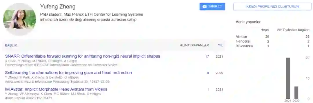 Yufeng Zheng 是马克斯 - 普朗克 · 苏黎世联邦理工学习系统中心(Max Planck ETH Center for Learning Systems)的一年级博士生,这是苏黎世联邦理工学院和马克斯 - 普朗克智能系统研究所的联合项目。她的导师为 Otmar Hilliges 教授和 Michael Black 教授。她的研究主要在于以人为中心的计算机视觉和图形领域,重点是基于学习的人脸和身体 3D 建模。在攻读博士学位之前,她获得了清华大学学士学位和苏黎世联邦理工硕士学位。
