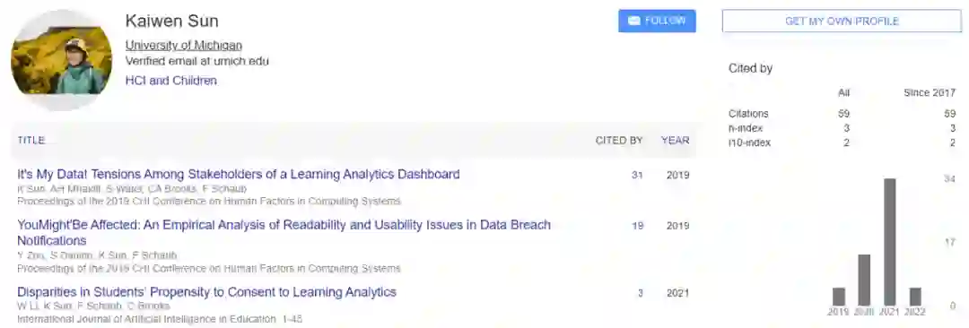 Kaiwen Sun 是密歇根大学信息学院的博士生,其导师为 Florian Schaub 博士和 Chris Brooks 博士。她的研究重点是通过设计和开发以儿童为中心的功能和控件,以在智能家居技术的环境下理解和支持儿童的隐私和安全需求。