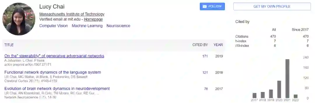 Lucy Chai 本科就读于宾夕法尼亚大学,现在是麻省理工学院电气工程与计算机科学系的博士生,导师是刚刚获得斯隆奖的 Phillip Isola。Lucy Chai 的研究重点是图像合成,特别是为交互式图像编辑和下游视觉分析任务生成增强的图像形式。